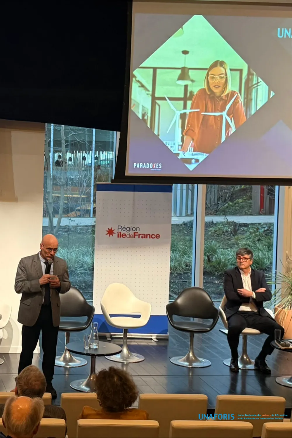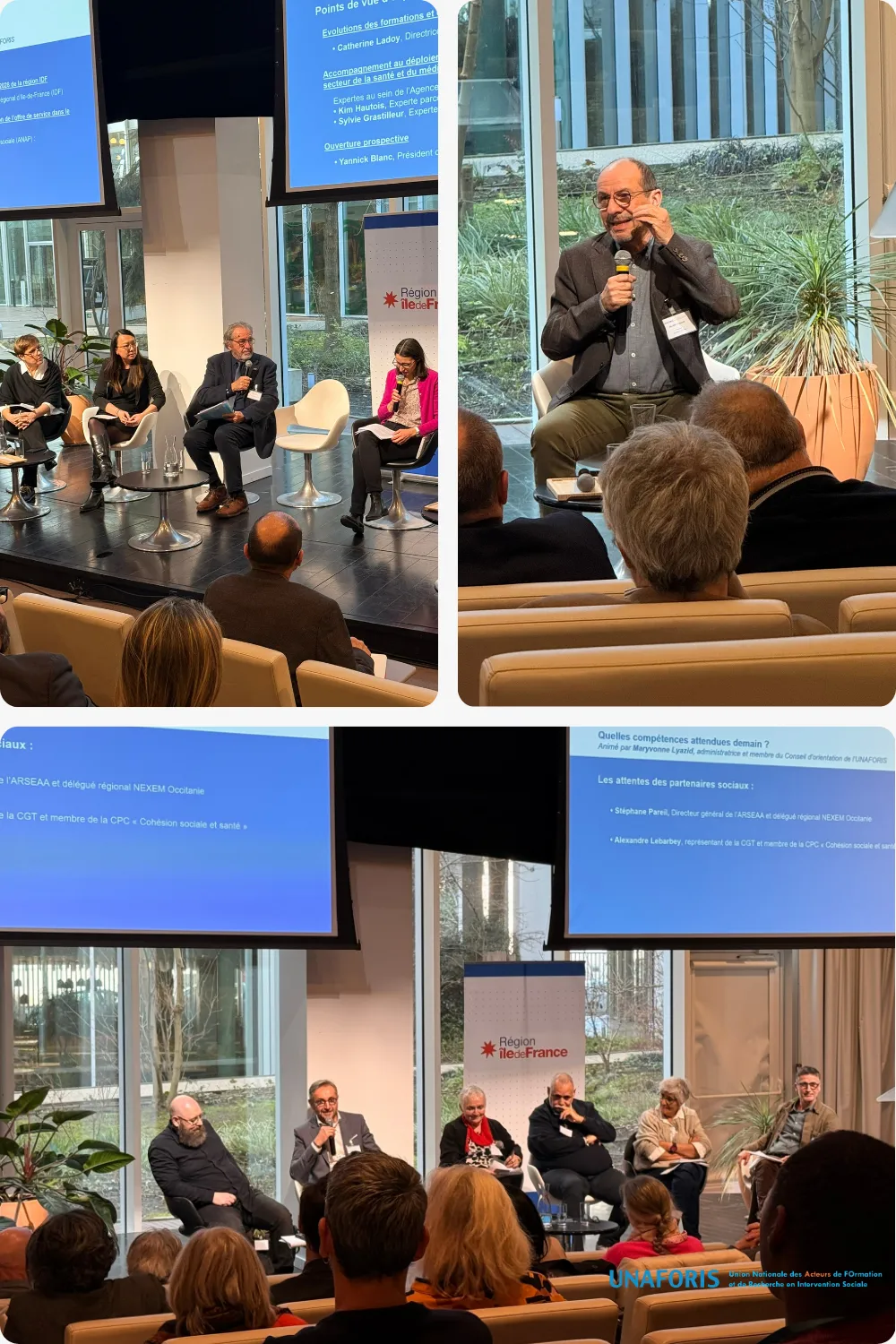 La matinée a débuté en présence d’Alix de La Coste, Directrice générale adjointe en charge du pôle TRESOR (Transfert, Recherche, Enseignement Supérieur, Sanitaire et Social : Objectif Réussite) au Conseil régional d’Île-de-France. Les propos introductifs de Marcel Jaeger, Président de l’UNAFORIS, et de Katia Lamardelle, administratrice et représentante de la plateforme Île-de-France, ont réaffirmé une évidence : le secteur social évolue rapidement et les formations doivent suivre ce rythme… sans perdre le sens.